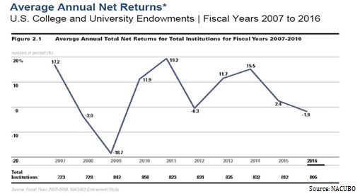 The average U.S. college and university endowment did not fare any better, with the average posting a negative 2% return in fiscal year 2016, as seen in the following chart.