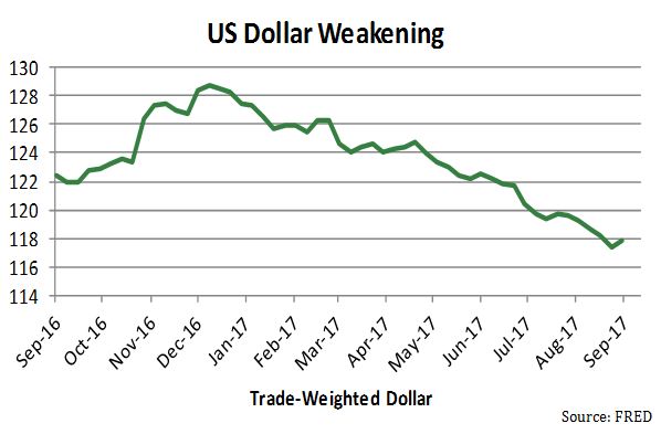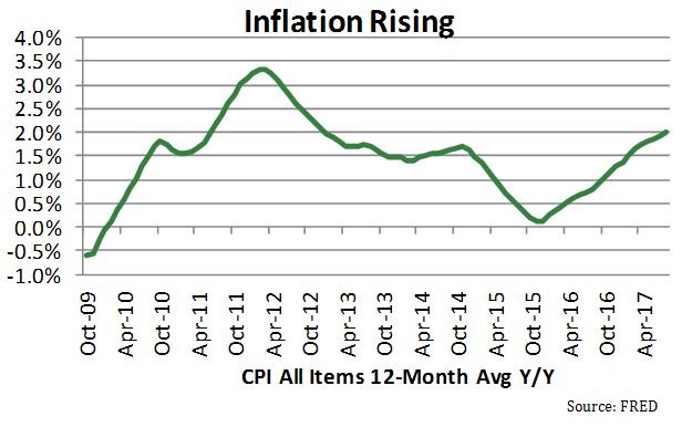Slow steady growth, low inflation/low interest rates and full employment seem to have become the norm. Yet this paradigm may soon be changing. We are starting to see signs of accelerating inflation. Both the skilled work force and unskilled labor are in high demand, which will drive up wages. The Dollar has dropped sharply this year against the Euro, the Yuan and the Mexican Peso. This weakening Dollar will increase the price of imported goods. Home prices are now above the 2006 peak as measured by the Case Shiller national median and climbing.