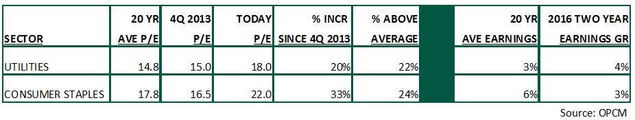 The first table shows historic and present price/earnings and earnings growth metrics. For example, over the last 20 years, utilities stocks have traded at an average P/E on forward earnings of 14.8x. At the start of the fourth quarter of 2013, utilities traded at a fair P/E of 15x. With the major outperformance over the past few years, the forward P/E of utilities has risen to 18x, which is a 20% increase since late 2013 and 22% above the long-term average. This indicates utilities are quite expensive versus history. Meanwhile earnings growth has only risen 4% per year over the last few years, meaning earnings have only grown half as fast as the P/E growth. Looking at consumer staples, the metrics are even more staggering as P/E’s are up 33% while earnings will have barely grown by 3% per year by the time 2016 ends.