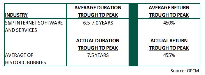 The second table refers to the rapid price appreciation in internet stocks. Remember, these are stocks that trade at extremely high valuations, but their earnings growth is supposed to offset the seemingly irrational valuations. This industry comprised of high fliers like Facebook, LinkedIn, Verisign, and Salesforce, trade at an enterprise value (EV) to EBITDA premium of three times the S&P 500. The table simply compares the prolific 455% rise in internet stocks over the last 7.5 years to the average duration and return of a group of the most well-known bubbles in history – the 1920’s stock market bubble, the 1970’s oil bubble, the 1980’s Japanese stock market bubble, the 1990’s internet bubble, and the 2000’s housing bubble. The result is growth investors have continued to overpay for internet stocks to the point where the price appreciation has matched, both in duration and return, many of the most significant bubbles in history.